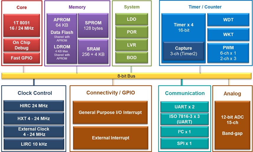 NuMicro® MG51TC1AE is an embedded Flash Memory type 1T 8051-based microcontroller. The instruction set is fully compatible with the standard 80C51 and performance enhanced. It supports 16 / 24 MHz core speed and features up to 32 KB of Flash Memory, 256 bytes of RAM and 4 KB of auxiliary RAM (XRAM), 4 KB of Flash loader memory (LDROM), 2.4V to 5.5V operating voltage, and -40°C to +105°C operating temperature.