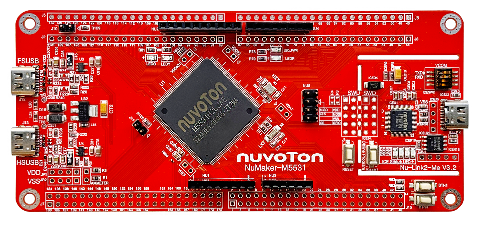 NuMaker-M5531 is a development platform built on the NuMicro® M5531 series microcontroller. This development board integrates essential system components and a wide range of peripheral interfaces, helping accelerate system design and the evaluation of prototyping.