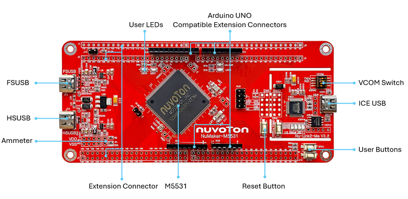 The NuMaker-M5531 target board provides Arduino UNO-compatible headers, multiple GPIOs, and common communication interfaces such as I2C, UART, and SPI. The onboard Nu-Link2-Me debugger and programmer supports the SWD interface, enabling both online and offline programming, as well as in-chip debugging. It also outputs debug messages to a PC via a virtual COM port (VCOM). In addition, the built-in status LED displays programming status in real time. The Nu-Link2-Me module is detachable and can be used independently as a production programming tool.
