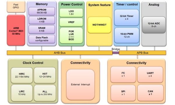 The NuMicro® M071MD2AE series is a 32-bit microcontroller based on Arm Cortex®-M0 core targeted for smart home appliance applications. It offers up to 50 MHz CPU frequency, 68 KB Flash memory for code storage, 8 KB SRAM for runtime operation. Additionally, in response to the code security requirements, the M071MD2AE series integrates flash security lock to provide a secure code execution area to protect the developer's intellectual property. The M071MD2AE series also supports online updates using In-System Programmer (ISP), In-Circuit Programmer (ICP) and In-Application Programmer (IAP). The In-System Programmer (ISP) with 4 KB Loader ROM (LDROM) supports firmware updates through the Firmware Over-The-Air (FOTA) process.