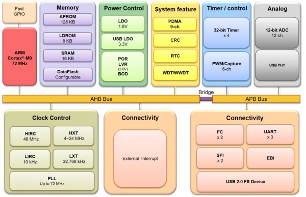 The M071SE3AE series supports plenty of peripherals, including one built-in temperature sensor with 1°C resolution, adjustable VDDIO pins to meet a wide voltage range from 1.8V to 5.5V, 6 channels of 16-bit 144 MHz high-speed PWM for precise control, 3 sets of UART, 2 set of SPI, 2 sets of I²C, and a Real-Time Clock (RTC). The M071SE3AE series also provides rich analog peripherals including 12 channels of 12-bit ADC and integrates one set of USB 2.0 full speed Device with on-chip PHY which supports crystal-less in device mode.