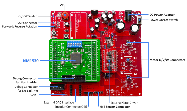 The NK-NM1530L includes the Nuvoton Low Voltage Motor Development Module MOS (Nu-LVMDM-MOS) and the Nuvoton Motor Development Adapter (Nu-MDA-NM1530). The Nu-LVMDM-MOS serves as the power stage, while the Nu-MDA-NM1530 functions as the microcontroller stage. Note that the NK-NM1530L does not include a debugging tool, so users will need additional ICE debugging equipment, such as the Nu-Link-Me, for development.