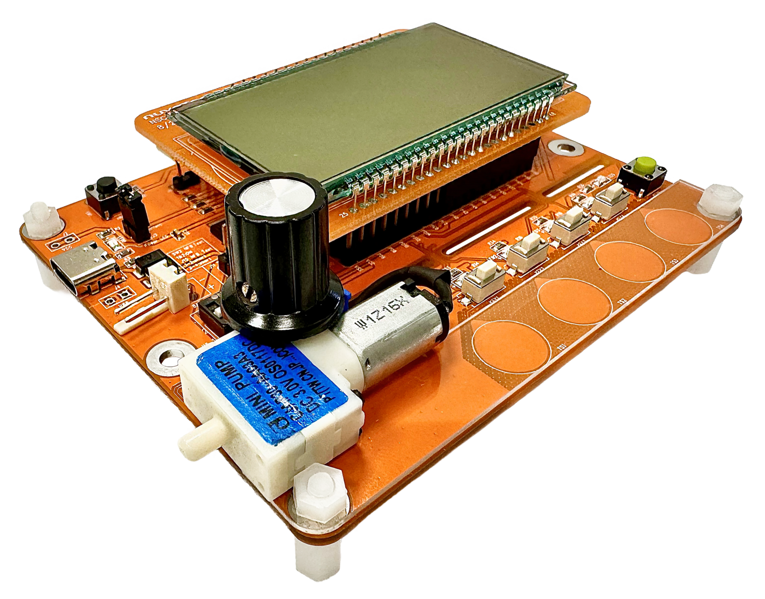 The board integrates various measurement and control interfaces, including Load Cell, PWM driver, Touch Pad, user buttons, and LEDs, enabling rapid development and testing of precision measurement applications.